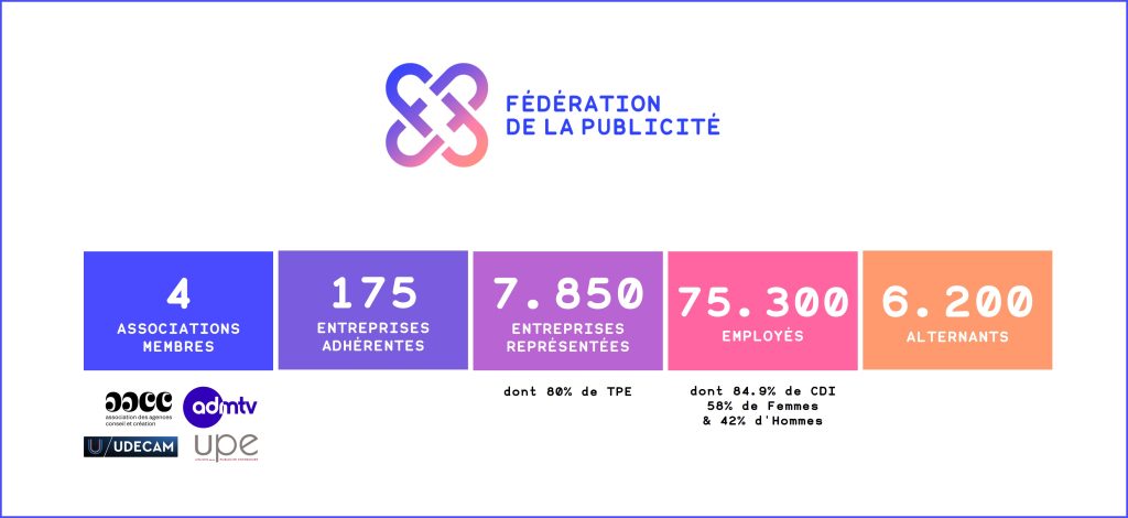 La Fédération de la Publicité regroupe 4 associations membres – l’AACC, l’ADMTV, l’UDECAM et l’UPE – représentant ensemble la diversité des métiers du secteur. Elle fédère 175 entreprises adhérentes, qui représentent à leur tour 7 850 entreprises sur l’ensemble du territoire, dont 80 % de très petites entreprises (TPE).